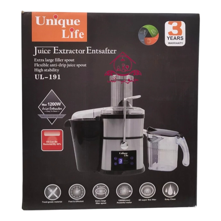 ⬅️ آبمیوه گیری تک کاره ⬅️ برند: یونیک لایف (اصلی) ⬅️ مدل: Ul_191 ⬅️ کیفیت عالی 👌 ⬅️ صفحه دیجیتال لمسی ⬅️ گلو استیل ضدزنگ دهانه بزرگ 70 mm ⬅️ توان: 1200 وات ⬅️ دارای 5 سرعت ⬅️ موتور سیم پیچ مسی ⬅️ ظرفیت مخزن تفاله: 2 لیتر ⬅️ ظرفیت پارچ آبمیوه 1 لیتر ⬅️ دارای سیستم ضد چکه ⬅️ دارای سیستم ضد لرزش ⬅️ دارای قفل و سوئیچ ایمنی