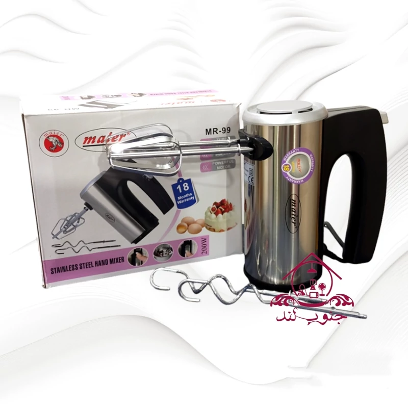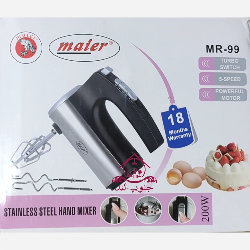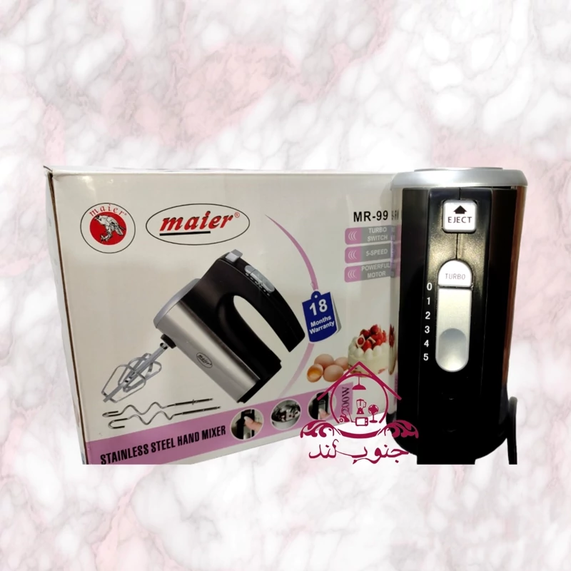 ⬅️ همزن دستی مایر maier آلمان ⬅️ کد: mr_99 ⬅️ دارای 5 سرعت ⬅️ موتور فول مسی ⬅️ توان موتور: 200 وات ⬅️ دارای چنگک همزن و خمیرزن