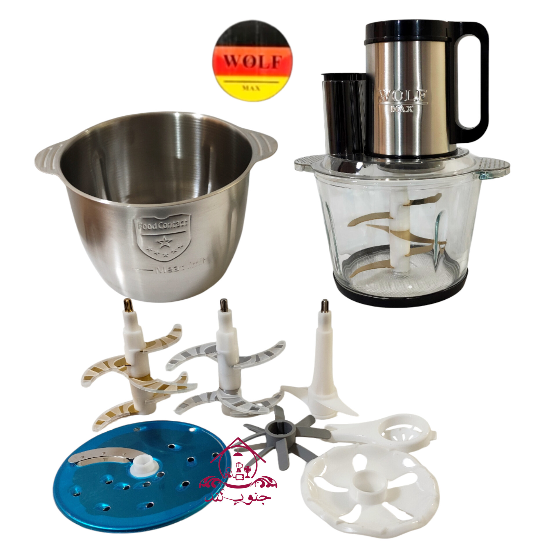 ⬅️ دارای 1ـ صفحه رنده 2ـ ورق کننده 3ـ سیر پوست کن 4ـ همزن 5ـ میکسر خمیر 6ـ خردکن